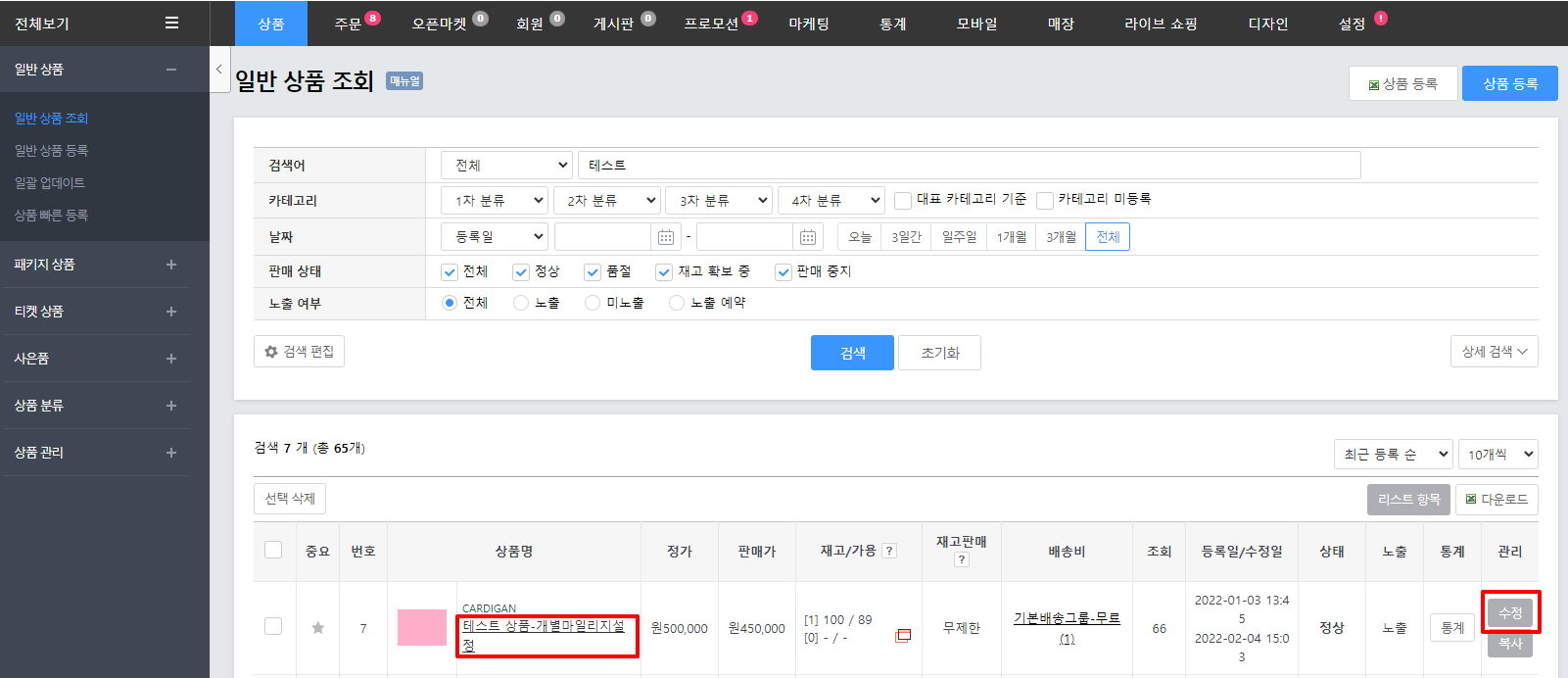1. '상품 > 상품 관리 > 일반 상품 조회'에서 수정하고자 하는 상품의 '상품명' 또는 '수정'을 클릭합니다.