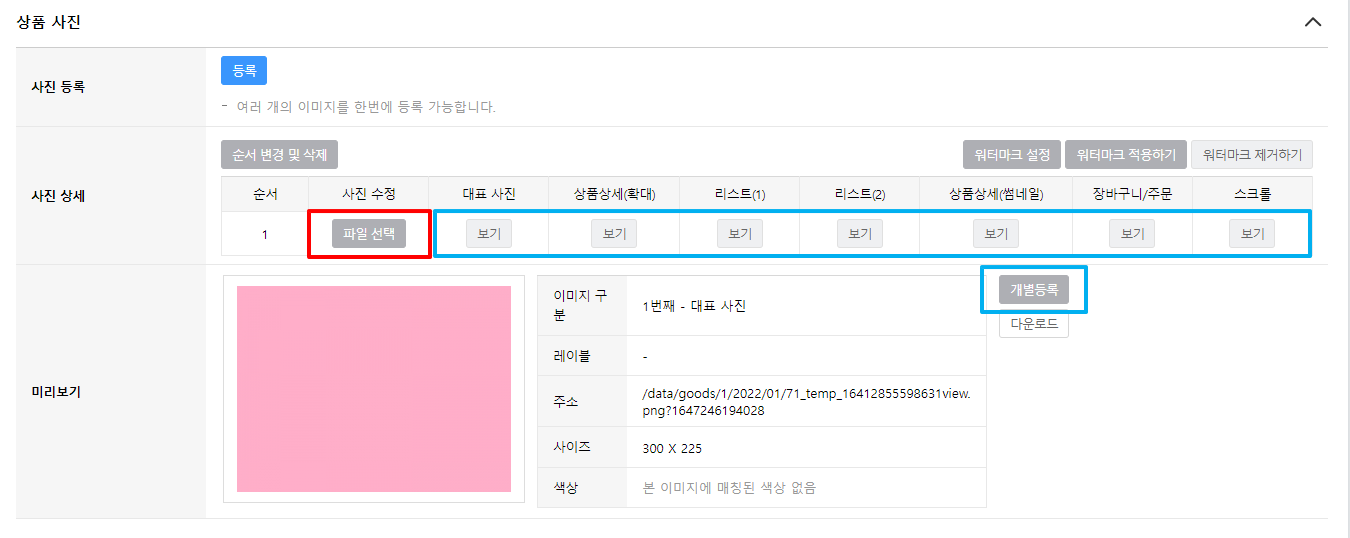3. 특정 분류의 이미지만 수정하려면 변경하고자하는 이미지의 '보기'를 클릭한 후 '개별등록'을 이용하여 이미지를 업로드 합니다.