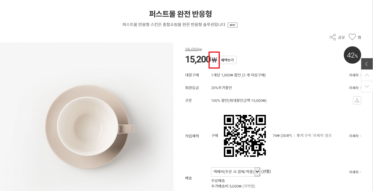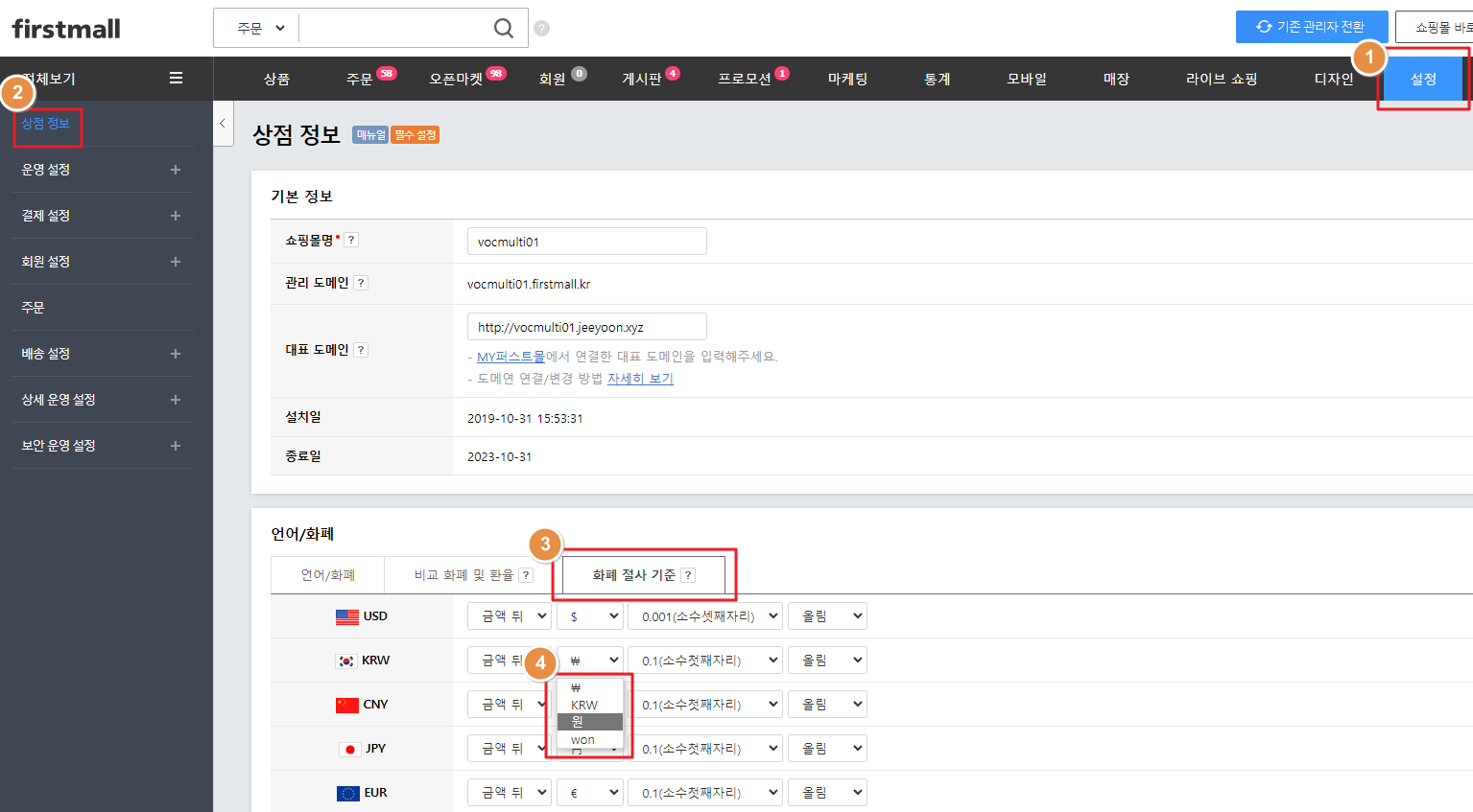 상품 리스트 화면이나 상품 상세화면에서 가격표시가 "원" 으로 표시되지않고 '₩' 으로 표시되어 수정을 원하는 경우 아래와 같은 방법으로 설정 가능합니다.