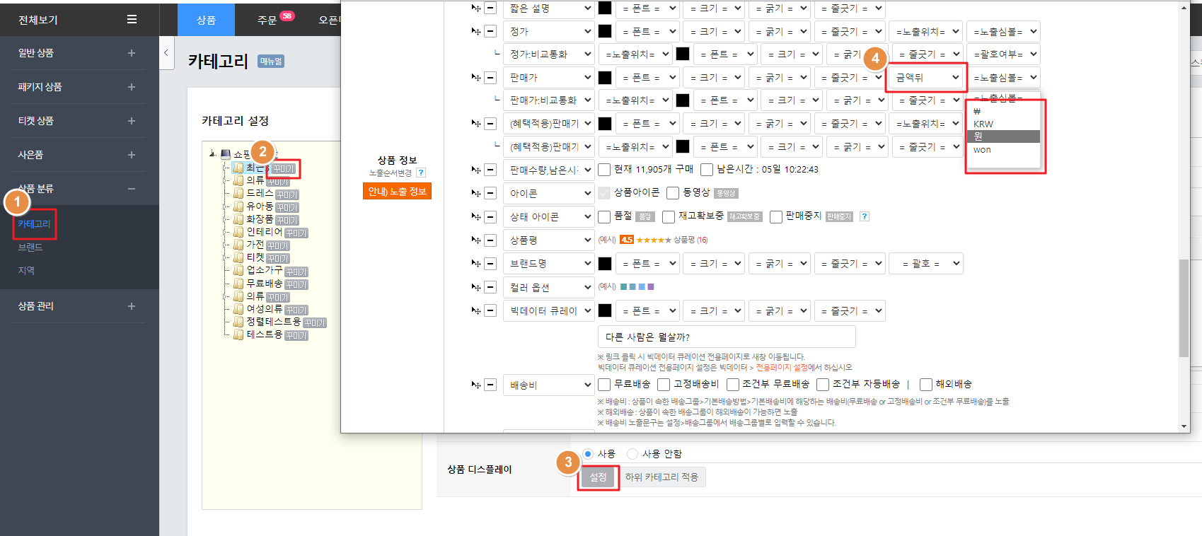 전용스킨을 사용할 겨웅에는 '상품 > 상품 분류 > 카테고리'에서 카테고리 꾸미기 버튼을 클릭하신 후 상품 디스플레이 설정하기를 통해 상품 노출정보를 수정해 주셔야합니다.