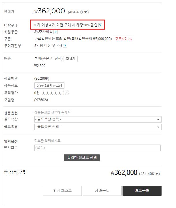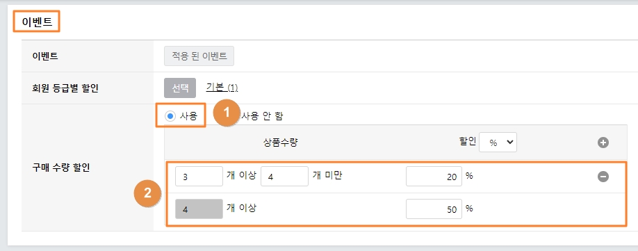 2. '이벤트'에서 '구매 수량 할인'을 '사용' 으로 변경 후 판매수량에 따른 할인률 설정할 수 있습니다.