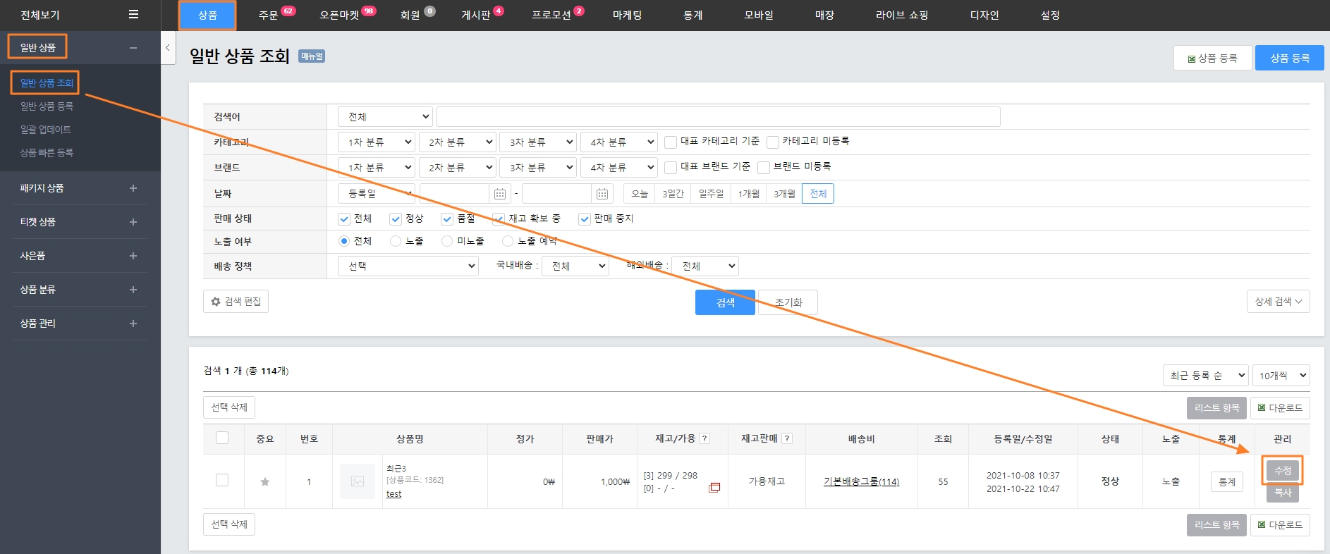 1. '상품 > 일반 상품 > 일반 상품 등록'에서 대상 상품의 '수정'을 클릭 합니다.