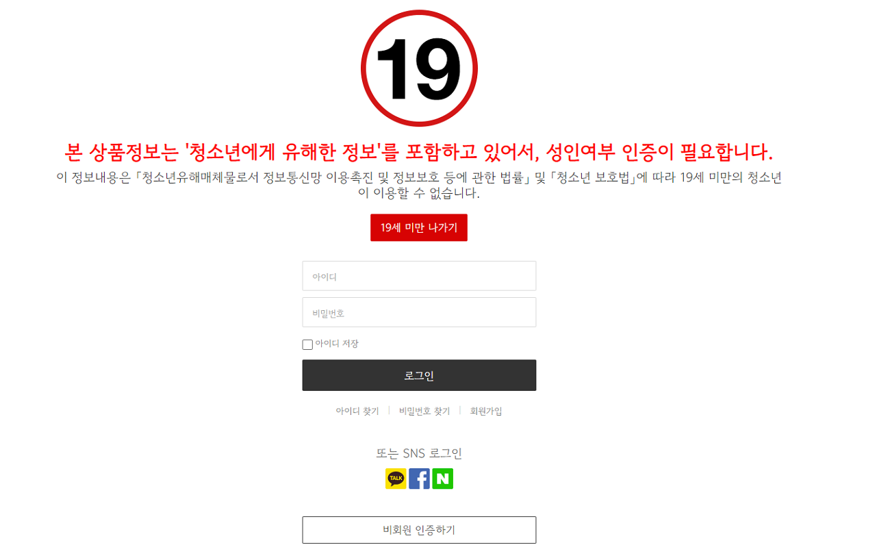 3. 쇼핑몰에 접속 시 다음과 같이 확인되며, 성인 인증이된 회원으로 로그인하거나, 비회원 인증하기를 클릭하여 성인 인증 후 이용가능합니다.