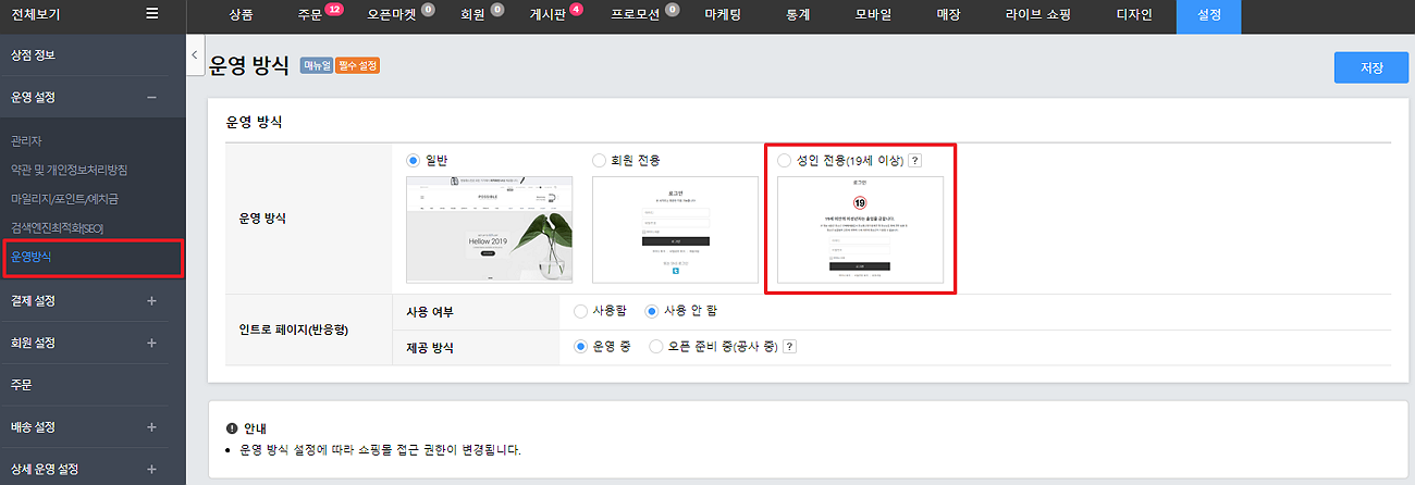 2. 본인확인 서비스 설정 후, '설정 > 운영 설정 > 운영방식'에서 '성인 전용(19세 이상)'선택 후 저장하면 설정이 완료됩니다.