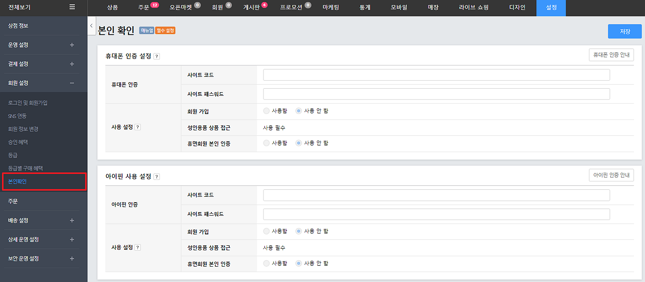 1. 성인 전용 쇼핑몰을 만들기 위해서는 '휴대폰 본인 인증' 또는 '아이핀'이 설정 되어있어야 합니다.