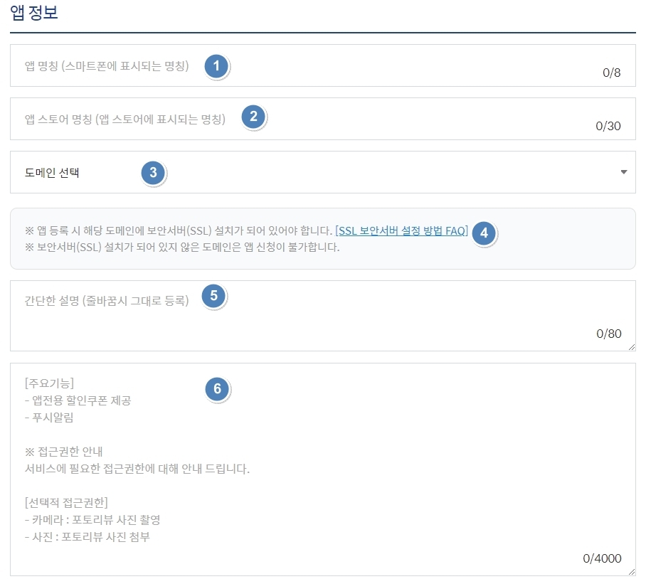 1) 제작된 앱을 사용자가 핸드폰에 다운받았을때 앱아이콘 아래에 나타나게 되는 앱이름입니다. (8자 미만)2) 앱을 다운받기 위해 스토어에 접속했을때 확인되는 앱이름입니다. 3) 보안서버(SSL)설치가 완료된 정식도메인을 선택해주세요4) 보안서버(SSL)설치가 안되어있다면 SSL보안서버 FAQ↗를 참고해주세요5) 스토어에서 앱을 검색했을때 앱정보에서 바로 보여지는 앱에 대한 간단한 설명글입니다.(80자 제한)6) 스토어에서 앱정보에 나타나는 간단한 설명글을 클릭했을때 보여지는 앱에 대한 자세한 설명글입니다. (4000자 제한)