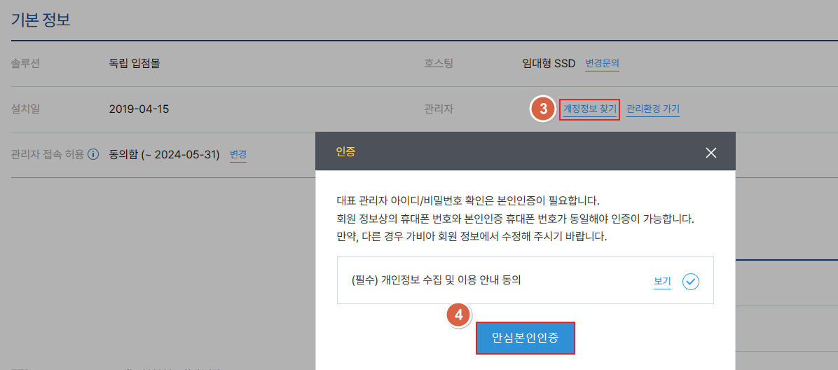 3. '기본정보'에서 '계정정보 찾기'를 클릭하여 본인확인 후 가비아↗ 등록된 휴대폰 또는 이메일로 임시비밀번호를 발급받으실 수 있습니다.