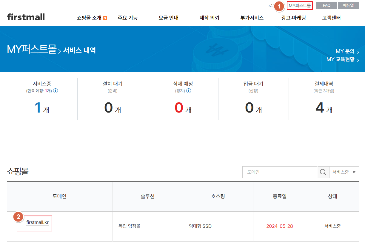 1. 퍼스트몰 홈페이지↗ 접속 후, 'MY퍼스트몰'로 이동합니다.2. 계정정보를 확인하시고자 하는 쇼핑몰의 '도메인'을 클릭합니다.