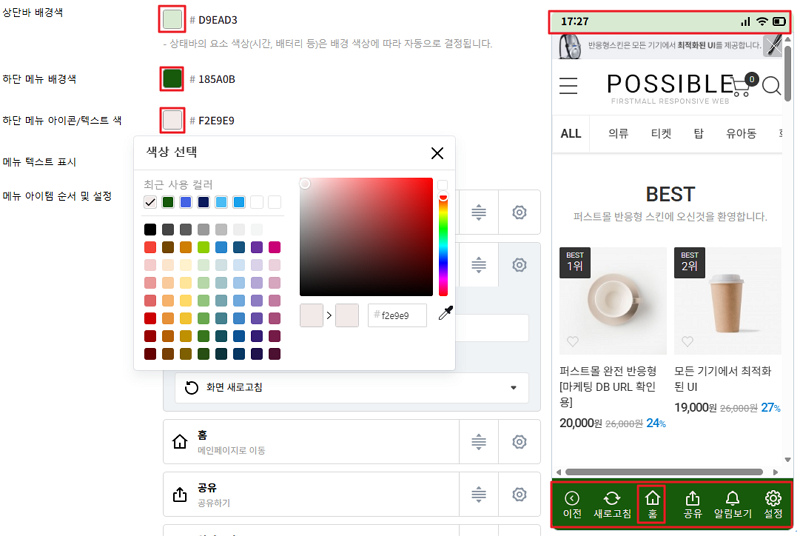 앱 화면 내 [상단바 배경색 / 하단 메뉴 배경색 / 하단 메뉴 아이콘 및 텍스트 색상]을 설정할 수 있습니다.