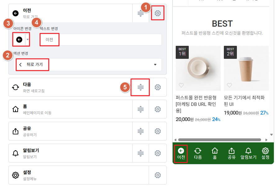 하단 메뉴의 아이콘과 노출 순서를 설정할 수 있습니다.