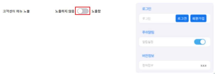 앱 '설정' 내에서 고객센터 메뉴의 노출 여부를 조절할 수 있습니다.