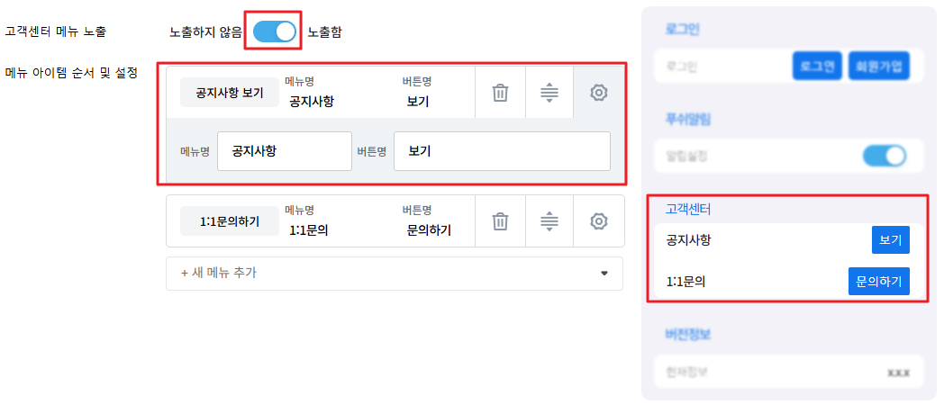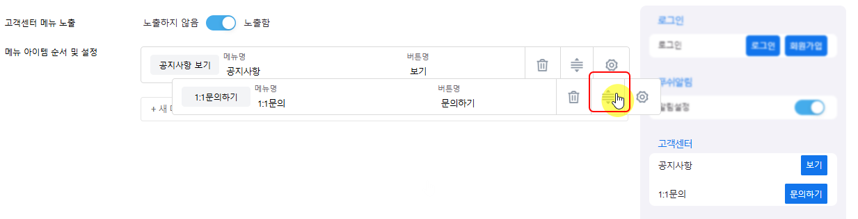고객센터 메뉴의 항목 및 노출 순서를 설정할 수 있습니다.