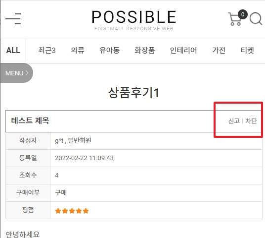 상품후기와 상품문의 게시판에 게시물에 대한 신고 및 차단 기능이 있어야 합니다. [게시판 > 게시판 등록/관리 > 상품후기 게시판 '수정']에서