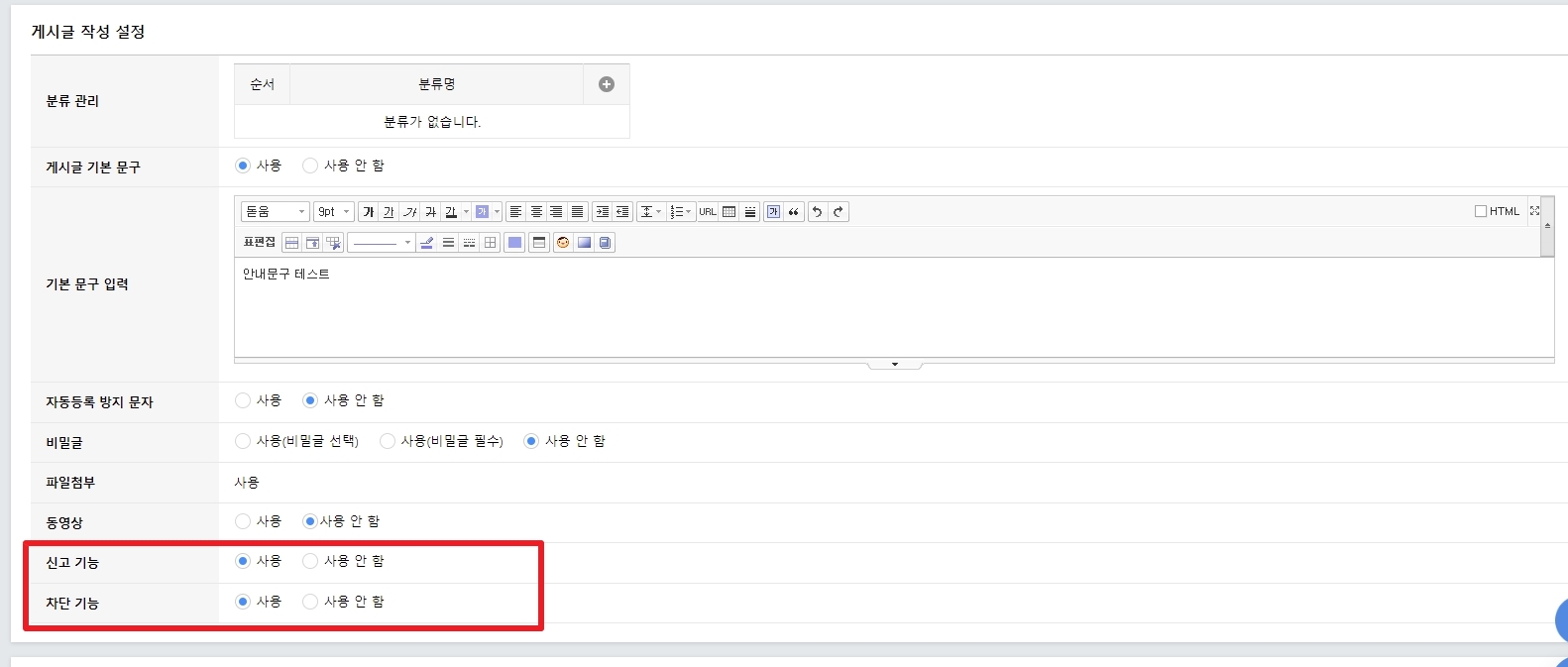 게시글 작성 설정 중 신고 기능과 차단 기능을 '사용'으로 설정해주세요