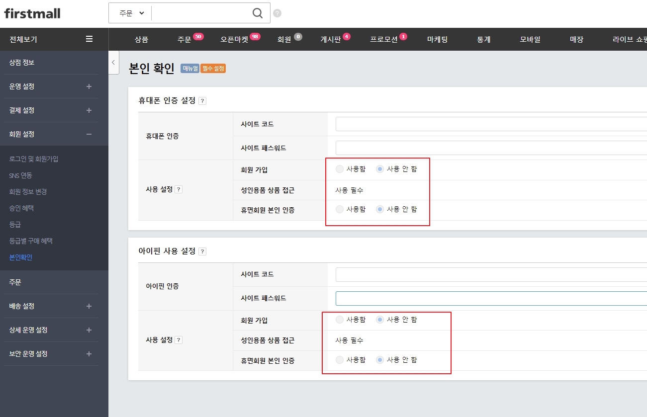 (IOS앱 신청시 체크사항)쇼핑몰 회원가입 시 본인인증 설정이 되어있는 경우 심사가 반려될 수 있습니다.