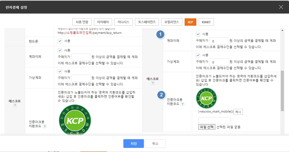 에스크로 계좌이체와 에스크로 가상계좌 항목을 '사용'으로 체크해주시고