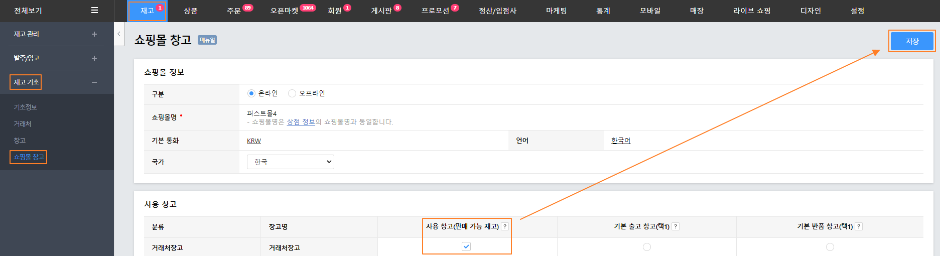 ■ 창고를 사용하지 않으려면 방법은 아래와 같습니다. 1. '재고 > 재고 기초 > 쇼핑몰 창고' 로 이동합니다. 2. 사용 창고에서 사용하지 않고자 하는 창고의 사용 창고 체크란을 해제해 주시고 저장버튼을 클릭합니다.