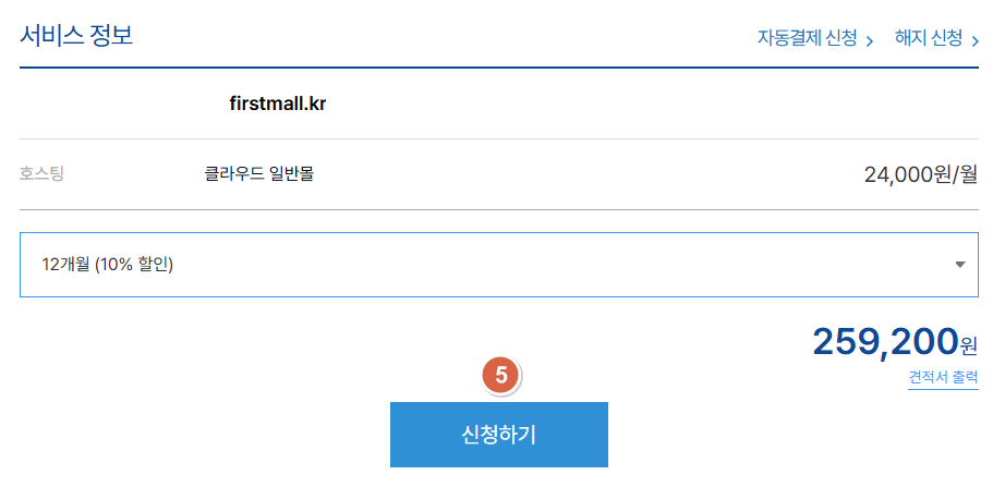 호스팅 연장 신청퍼스트몰 홈페이지 우측 상단의 'MY퍼스트몰' 클릭호스팅 연장을 진행할 쇼핑몰의 도메인 클릭호스팅 정보 항목의 '연장/해지' 버튼 클릭 연장 기간 선택 후 '신청하기' 버튼 클릭결제수단 선택 후 결제 진행신청하기 버튼 우측의 '견적서 출력' 버튼을 클릭하면 견적서를 출력받으실 수 있습니다.