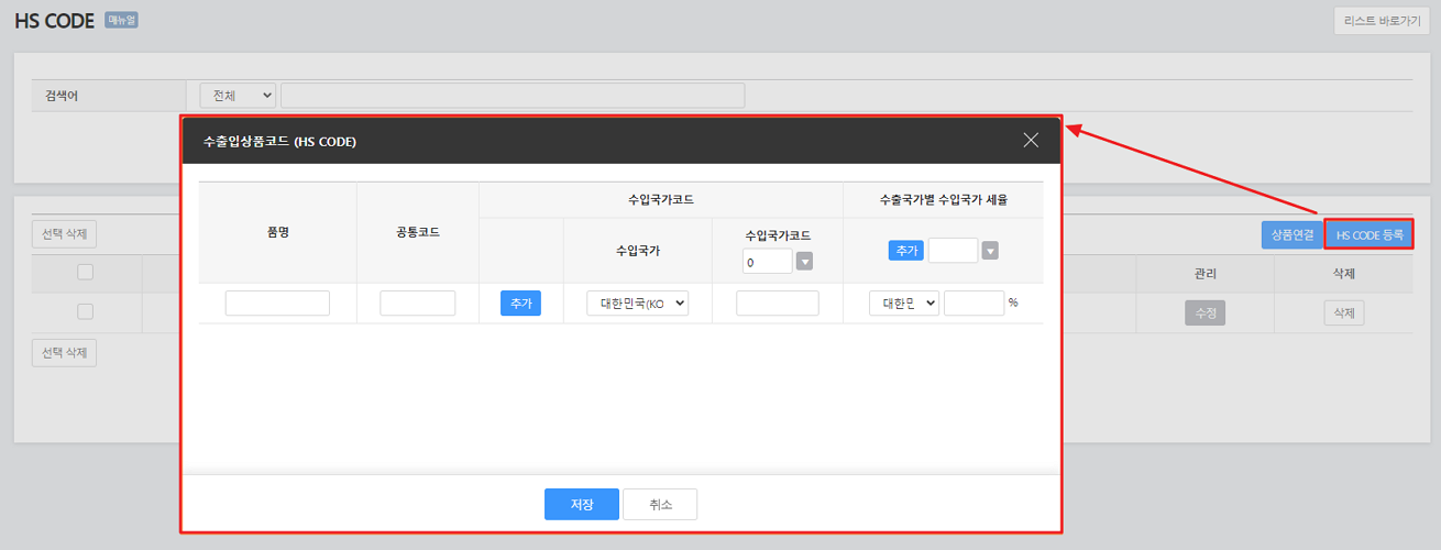 수출입코드를 선택하시기 위해서는 사전에 HS CODE 등록을 진행하셔야 하며, 바로 가기 > 버튼을 클릭하시어 HS CODE 설정 페이지에서 HS CODE를 등록해주시기 바랍니다.