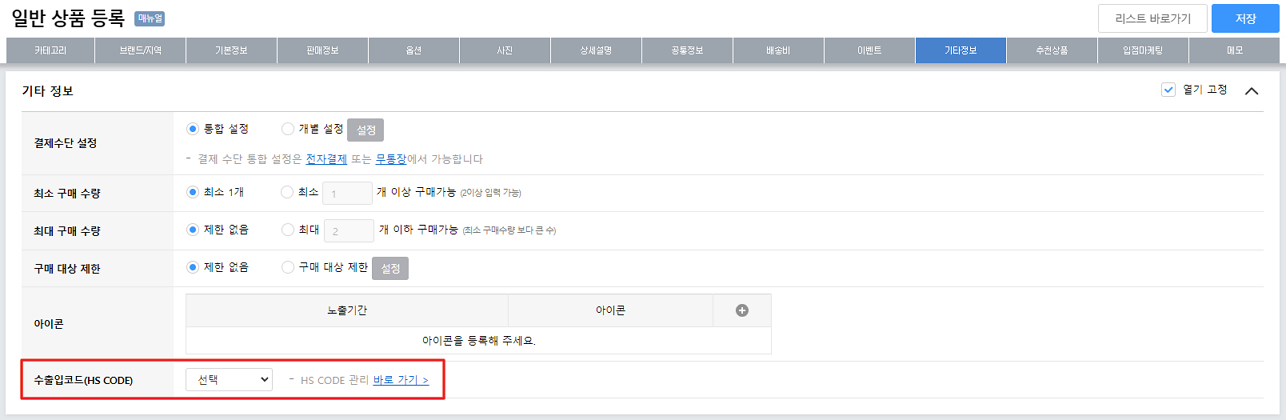 상품등록 시 상품등록 페이지의 기타 정보에서 수출입코드(HS CODE)를 선택하실 수 있습니다.