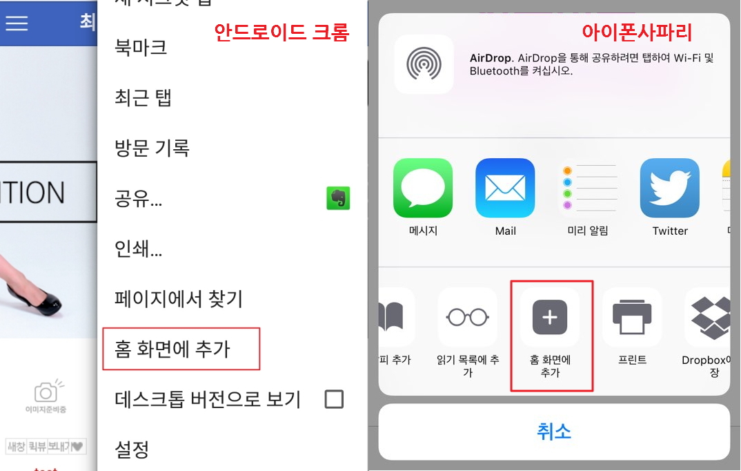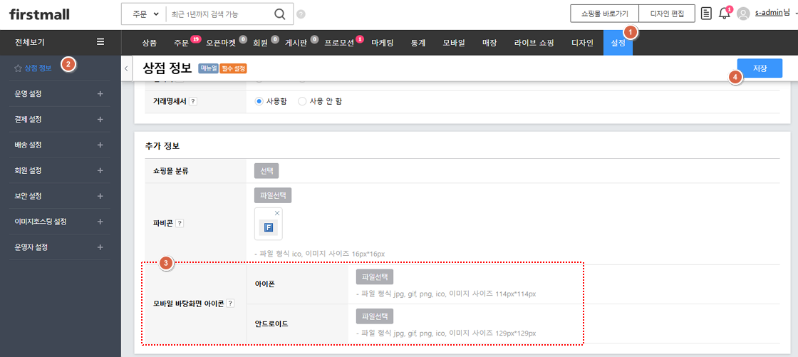 1. '설정 > 상점정보 > 추가정보'에서 '모바일 바탕화면 아이콘'을 업로드 할 수 있습니다. 2. 각 모바일 브라우져에서 '홈화면에 추가'을 선택하시면 3. 스마트폰 바탕화면에 바로가기 버튼이 생성됩니다