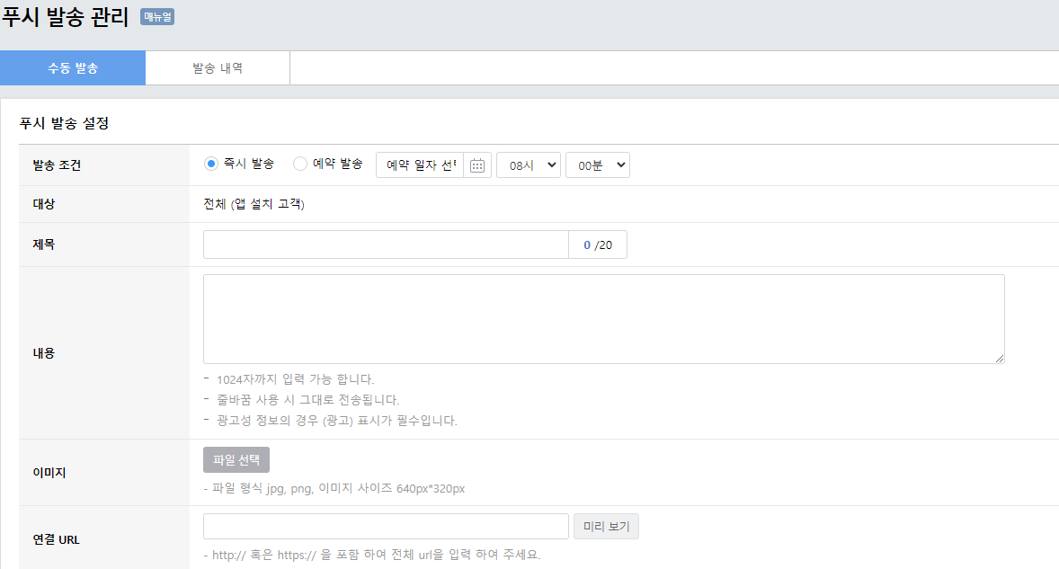 '모바일 > 모바일앱 > 푸시 발송 설정'을 통하여 발송제목, 내용, 이미지, 연결 URL등을 입력하여 이용할 수 있습니다.