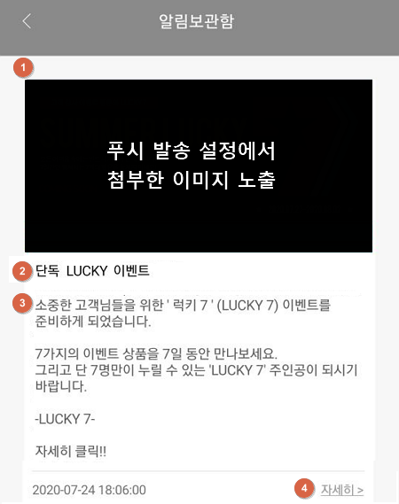 발송된 메세지는 쇼핑몰앱 실행시 알림보관함에서 확인 가능합니다.