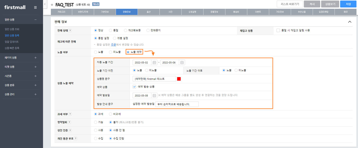 상품의 노출 예약 기능을 설정하시어 특정 기간에 상품 노출여부를 설정하실 수 있으며, 이를 통한 예약판매 설정이 가능합니다.