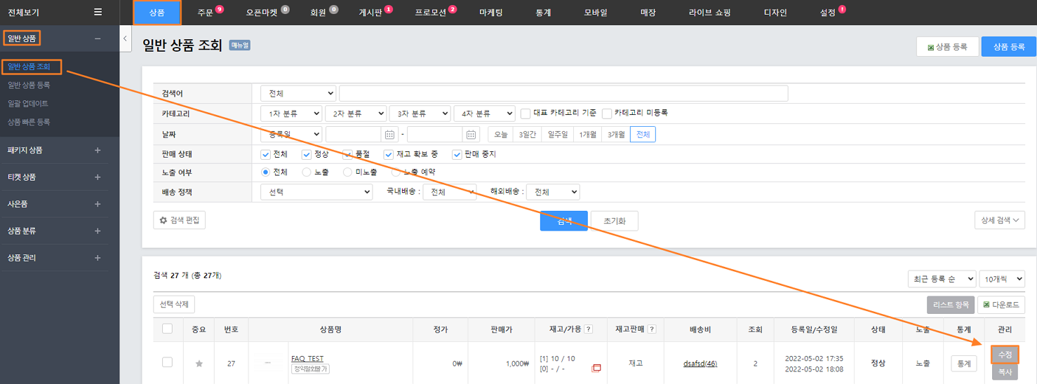 1. '상품 > 일반 상품 > 일반 상품 조회'에서 예약 상품으로 설정하고자 하는 상품을 '수정'을 클릭합니다.