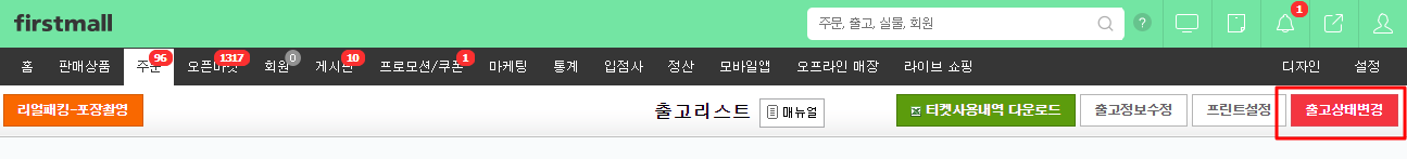 3. 출고상태변경주문 > 출고조회 메뉴로 이동하여 우측 상단의 [출고상태변경] 을 클릭합니다.