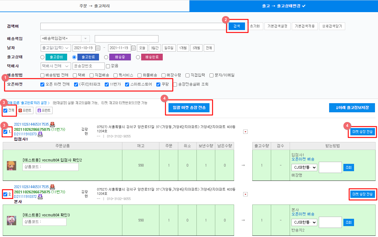 또한 출고 처리 시 반드시 주문서 상태가 '배송중'으로 변경되어야 해당 주문이 접수된 오픈마켓 주문건으로 송장번호를 전송합니다.
