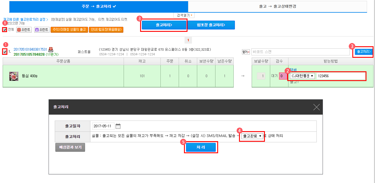 '출고완료' 상태로 설정 후 [처리]를 클릭합니다.※ 유효하지 않은 송장번호를 입력한 경우 송장 전송에 실패할 수 있으니 유의하시기 바랍니다.