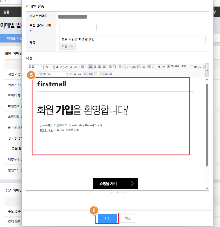 E-mail 자동발송 내용은 SMS 자동발송과 마찬가지로 초기에 고객의 쇼핑몰에 맞게 변경하셔야 합니다.
