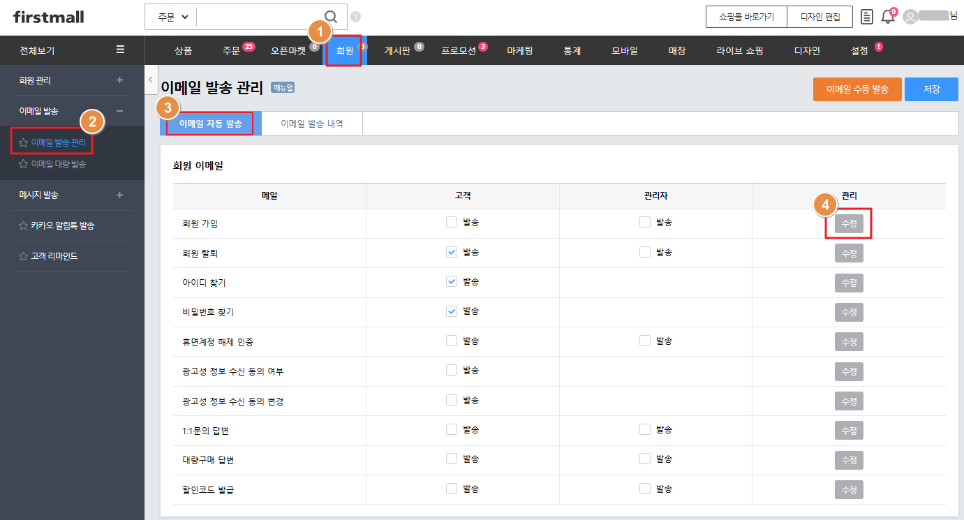 관리자 페이지 '회원 > 이메일 발송 관리 > 이메일 자동 발송'에서 '수정'버튼을 클릭하여 발송내용을 수정할 수 있습니다.