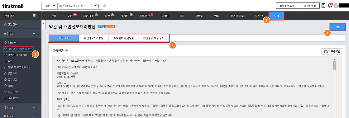 설정 > 운영 설정 > 약관 및 개인정보처리방침