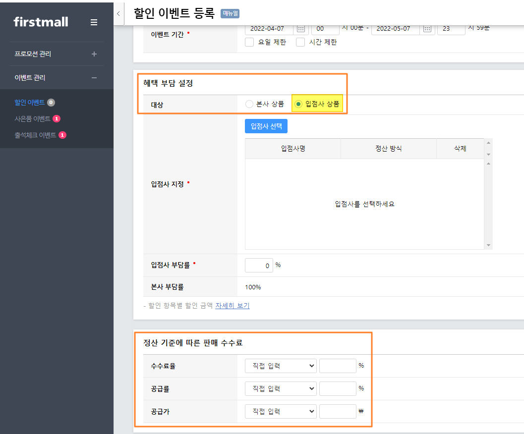 할인이벤트 등록 시 정산에 반영되는 수수료를 설정하실 수 있습니다.