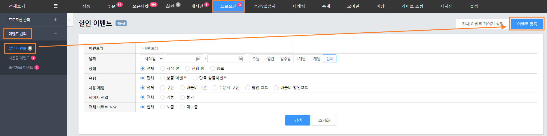 '프로모션 > 이벤트 관리 > 할인 이벤트'에서 '이벤트 등록'을 통해 할인 이벤트 추가가 가능하며,