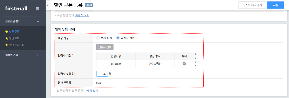 '할인 쿠폰/코드/유입경로'와 같은 프로모션은 본사와 입점사간의 할인 부담율을 조정할 수 있습니다.