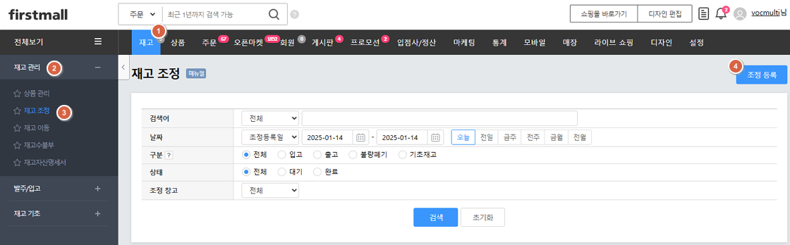 실제 재고와 시스템 재고가 다를경우 '재고조정'을 이용하여 맞출 수 있습니다.