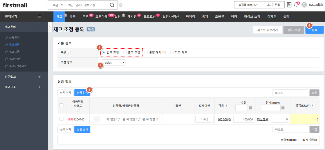 2. '입고 조정' 또는 '출고 조정'을 클릭하고 '조정 창고'를 선택한 후, 상품을 검색하여 로케이션, 수량, 단가 등을 입력하여 등록합니다.