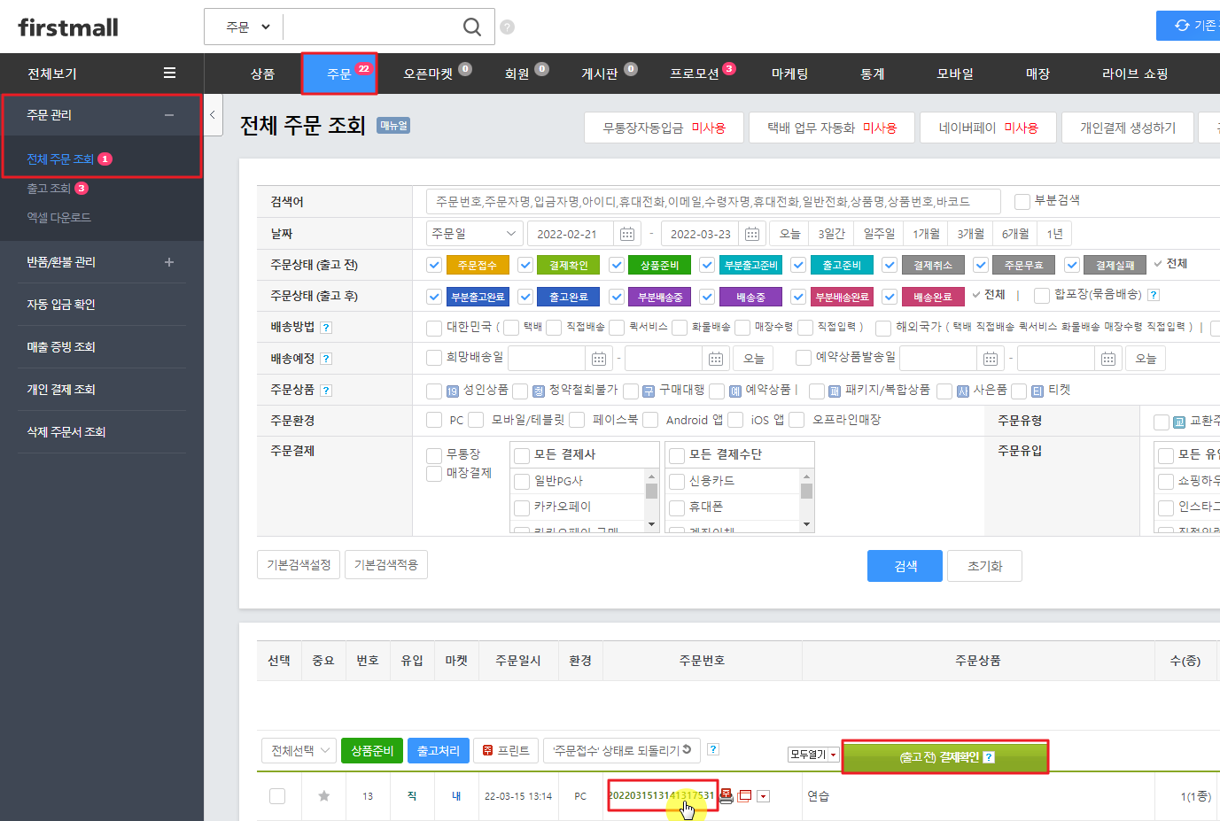 1) '주문 > 주문 관리 > 전체 주문 조회'에서 주문을 검색한 후 '주문번호'를 클릭합니다.