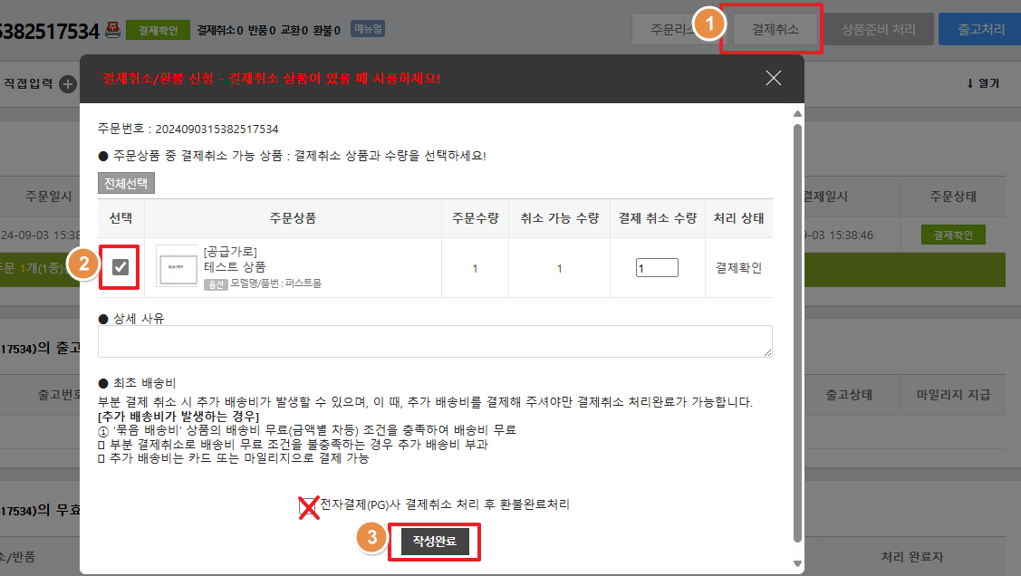 2) 상단의 '결제취소'클릭 후 상품선택 및 상세사유 작성 후 '작성완료'를 클릭합니다.
