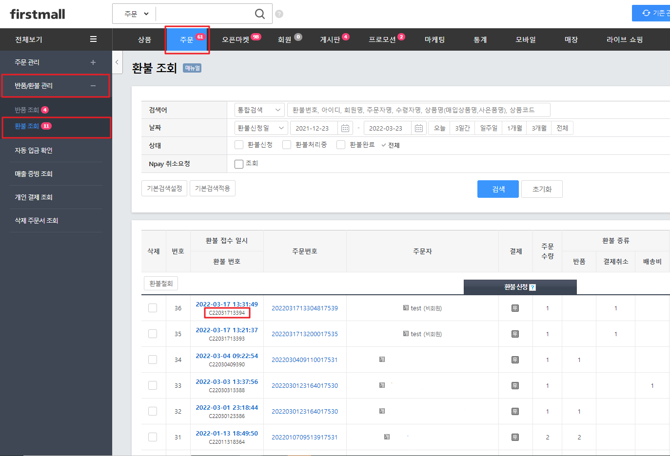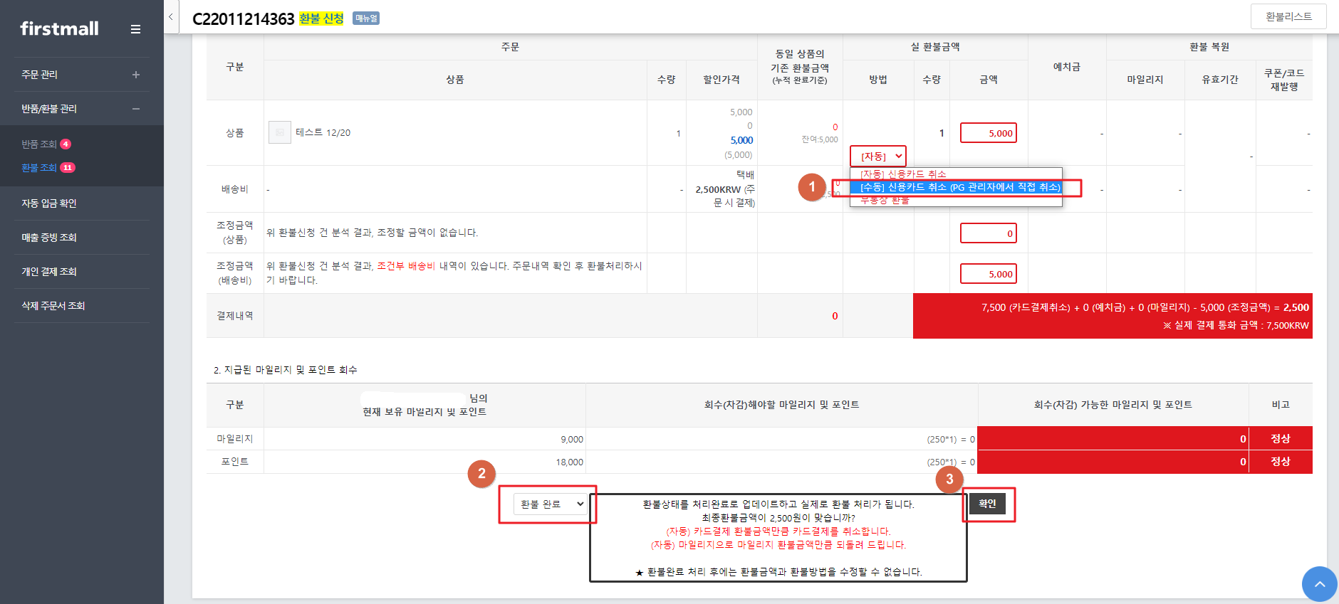 ※ 반품 리스트에서 반품 완료처리 하신 후 환불과정을 진행 하실 수 있습니다.