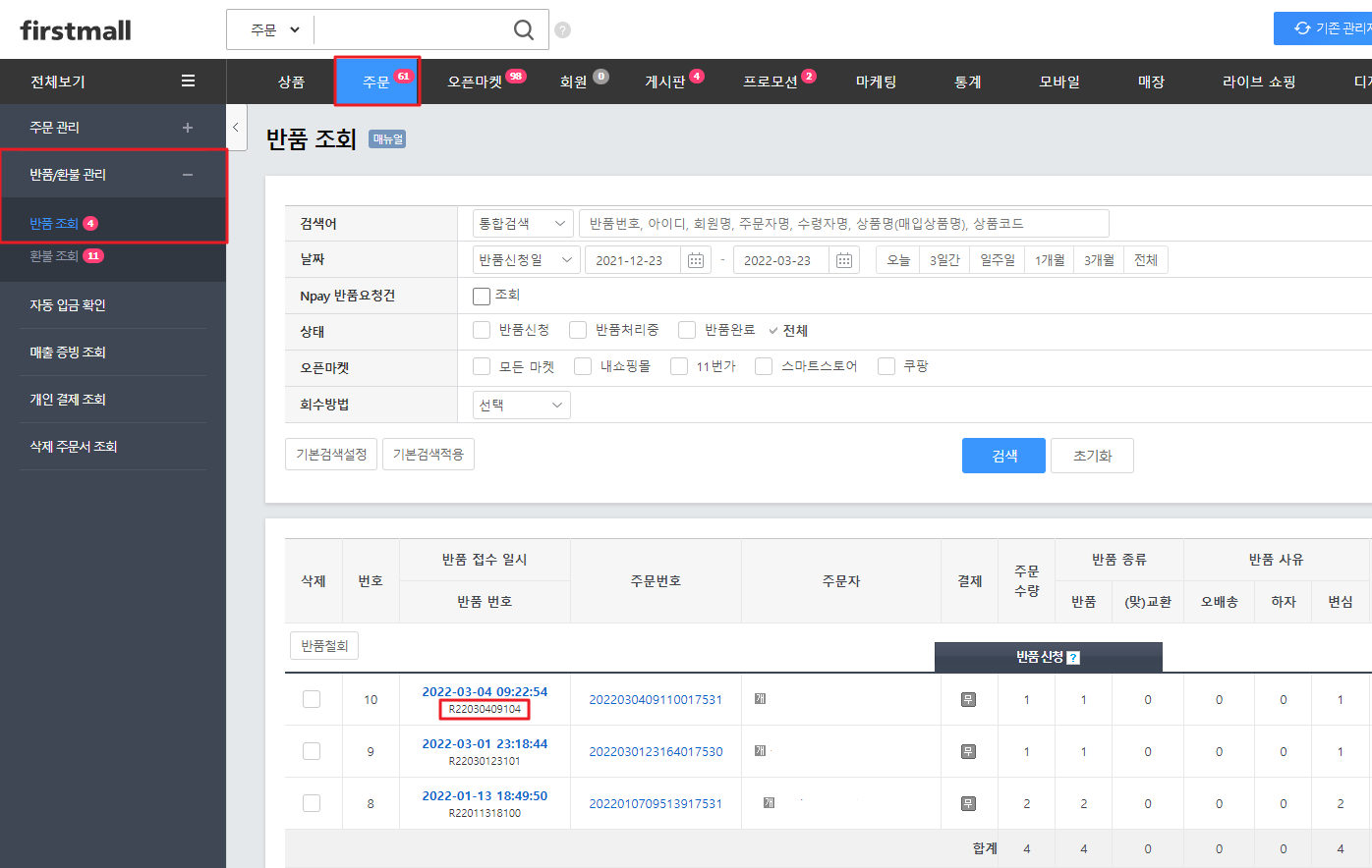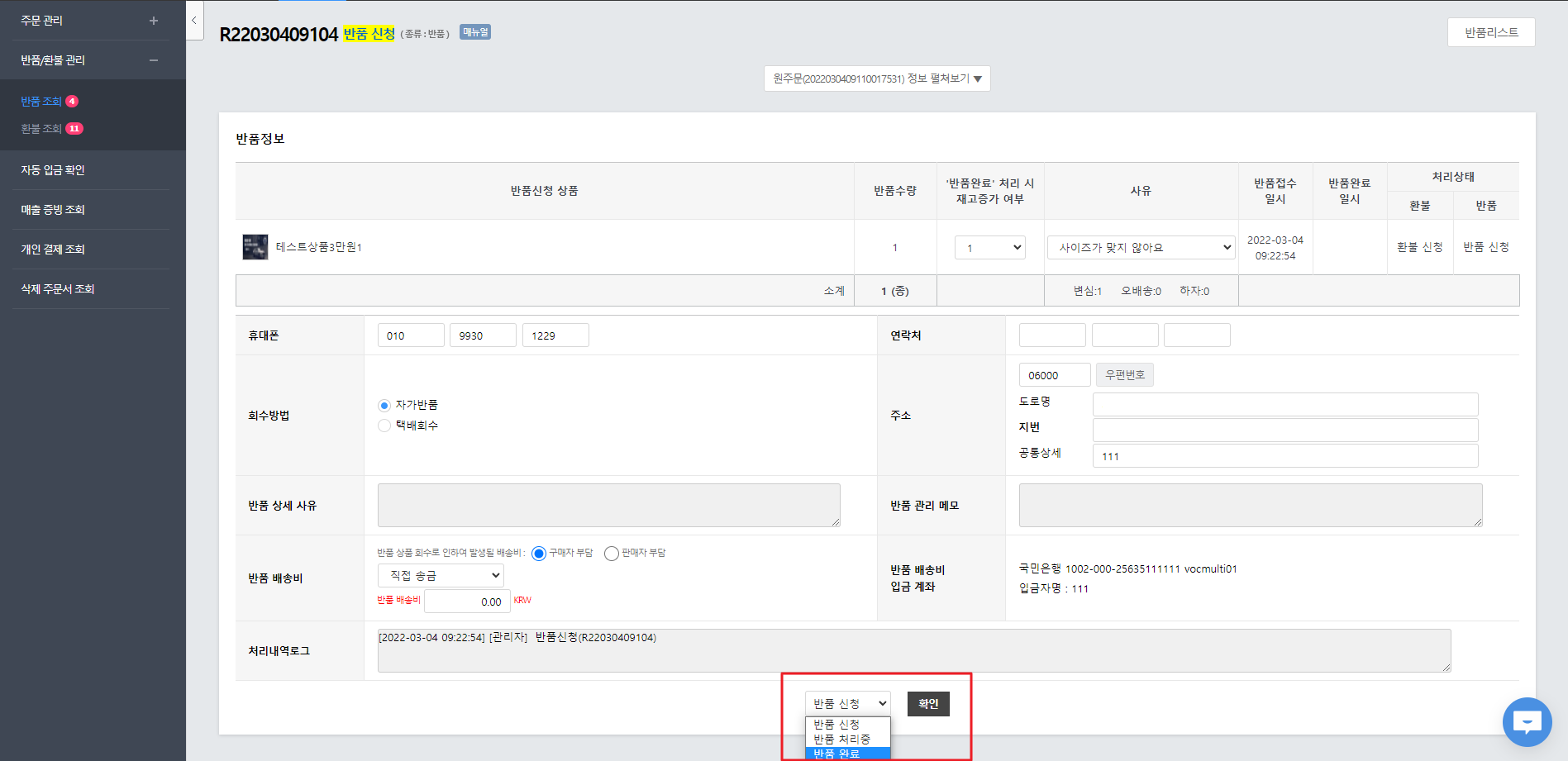 1) '주문 > 반품/환불 관리 > 반품조회'에서 '반품 완료'로 완료처리합니다.
