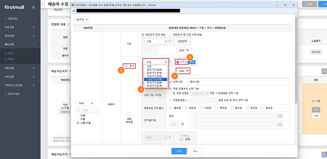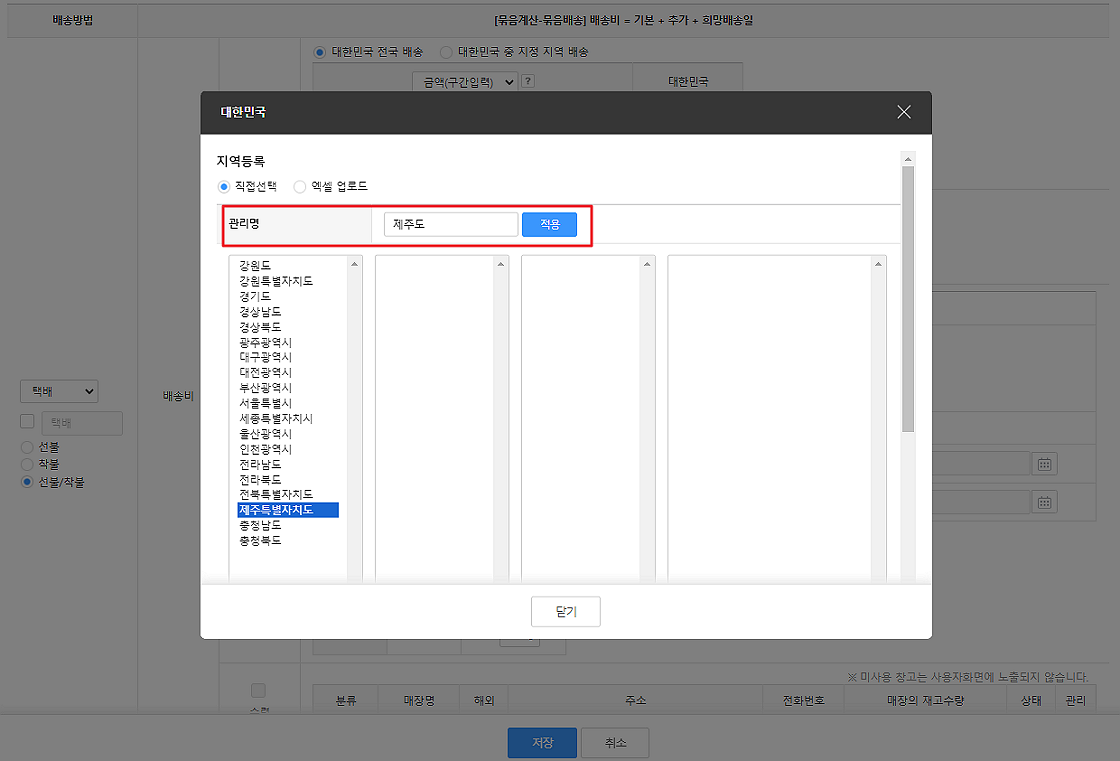 ※ 등록하실 때 관리명 부분의 '지역1'을 추가하는 지역에 대해 관리하실 이름으로 변경하여 저장을 하시면 배송그룹 상세에서 지정하신 이름으로 관리를 하실 수 있습니다.