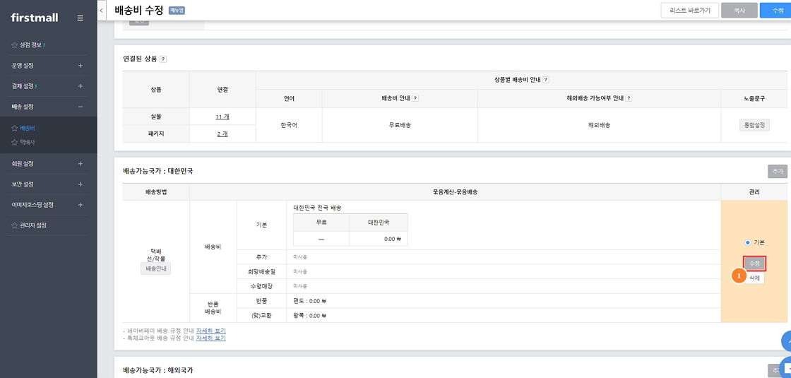 2. '배송가능국가 : 대한민국' 부분의 '수정' 클릭합니다.