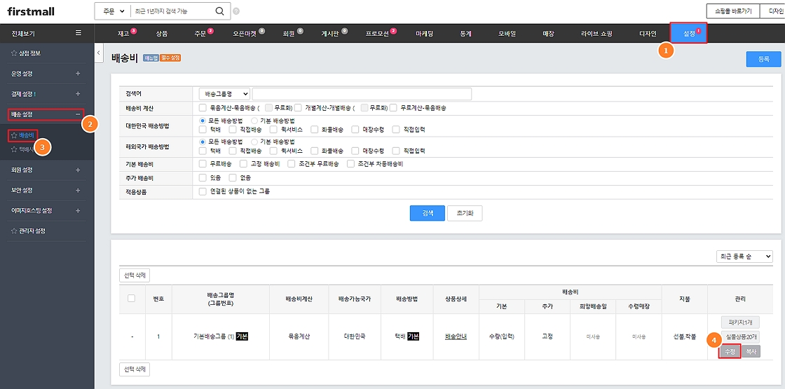 1. '설정 > 배송설정 > 배송비'에서 설정할 배송그룹의 '수정' 클릭합니다.
