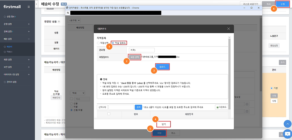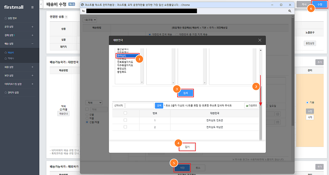 4. 지역등록 창에서 추가 배송비 지역을 '선택' 후 하단의 '등록'으로 지역을 추가하고 배송비 설정창을 '저장' 후 배송비 수정 페이지 우측 상단의 '수정'까지 클릭하시면 이용 가능합니다.
