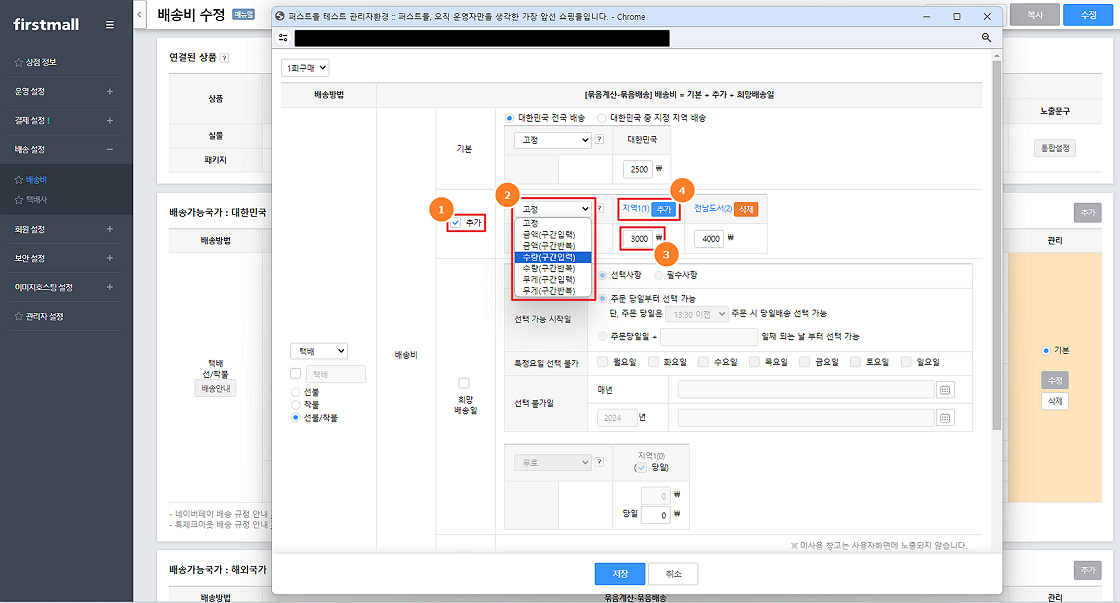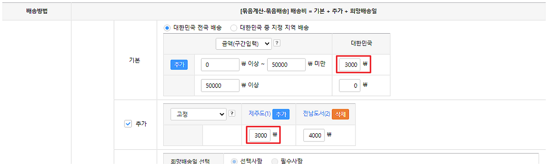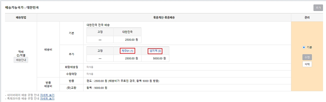 ※ 지역별 배송비 입력 시 기본 배송료+입력한 각 지역의 배송료로 계산됩니다. 예를 들어 제주도의 기본 배송비 3,000원에 추가 배송비 3,000원이 더해져 6,000원의 배송비가 청구 됩니다