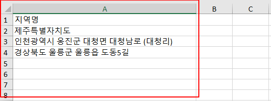 5. 엑셀에 정확한 도로명 주소를 입력합니다.예) 경상북도 울릉군 울릉읍 도동5길 (O)# 예를들어 경상북도 울룽군 전체로 이용할 경우에는 아래와 같이 입력 가능합니다. 경상북도 울릉군 (O)# 엑셀 등록 시 참고 이미지